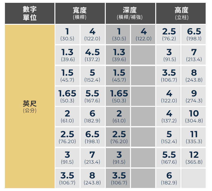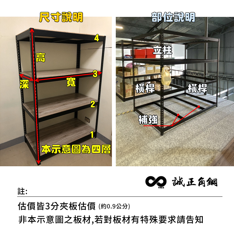 1.表格數字 1.5:英呎 / (45.7):英呎對應公分 2.實際空間寬度請多預留2~3公分 3.高度可加價裁切,寬深尺寸固定 4.一片木板即算一層,計算範例可參考下圖右 5.提供【寬*深*高*幾層】即可為您估價